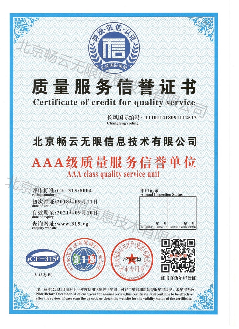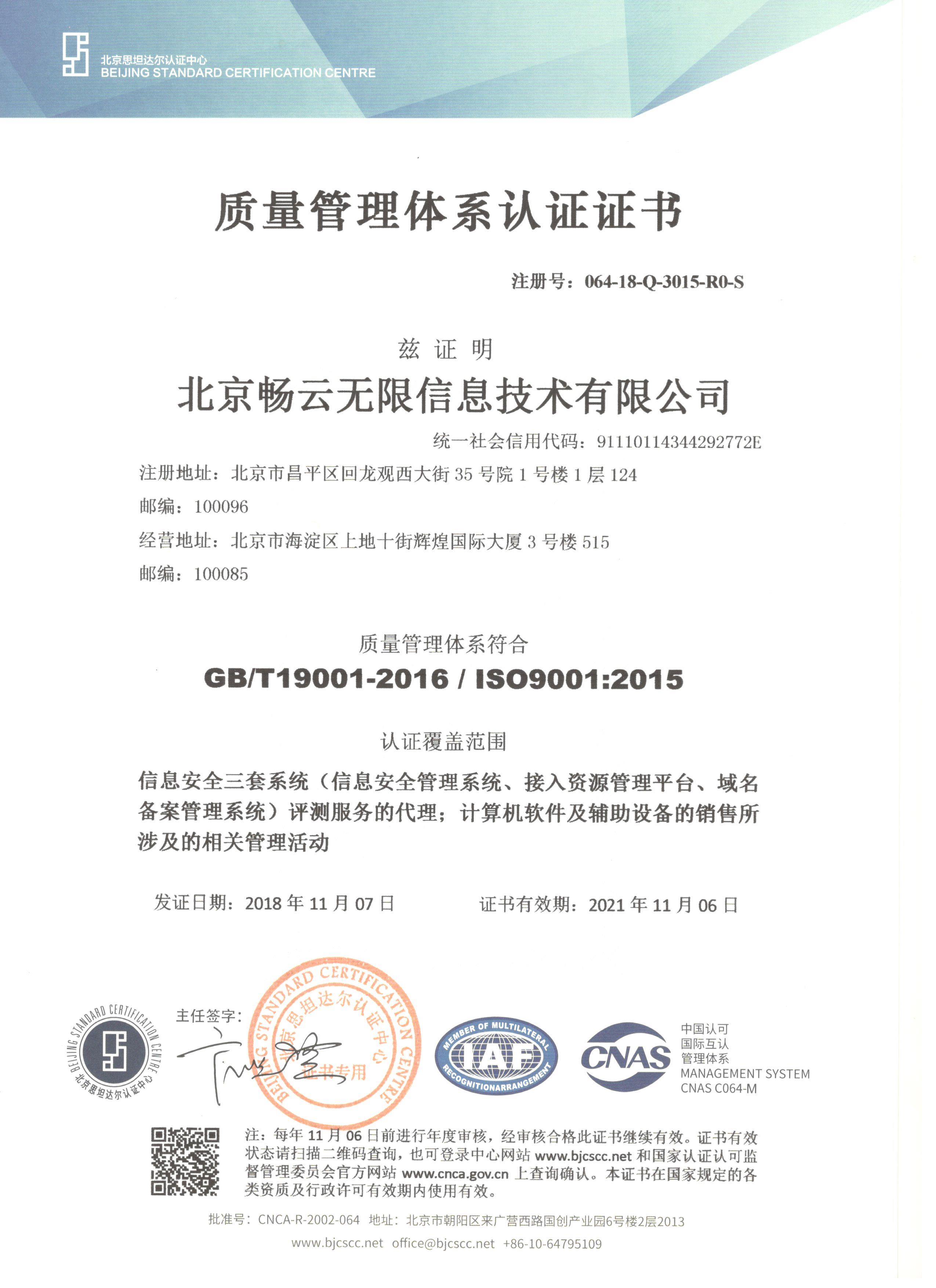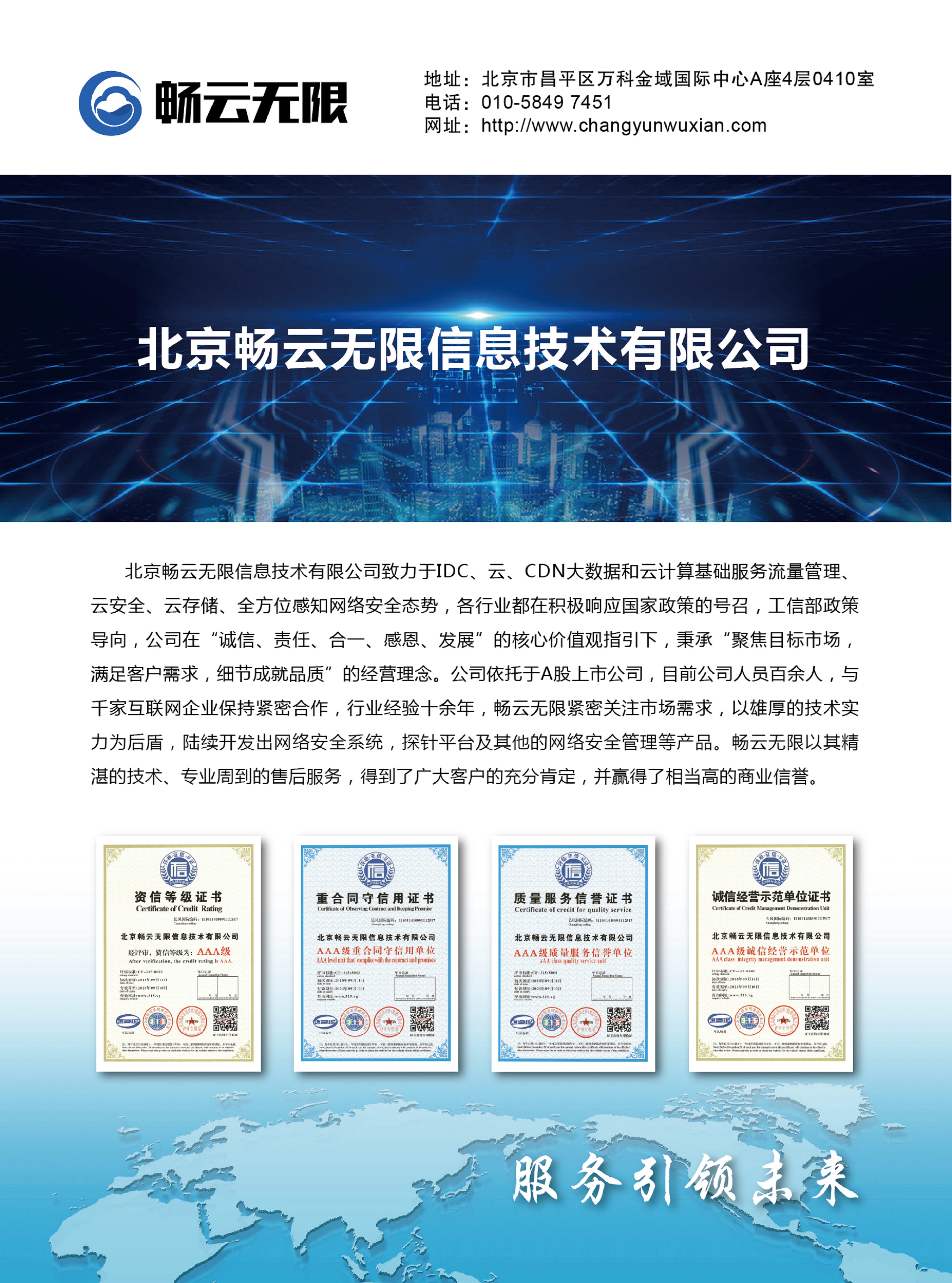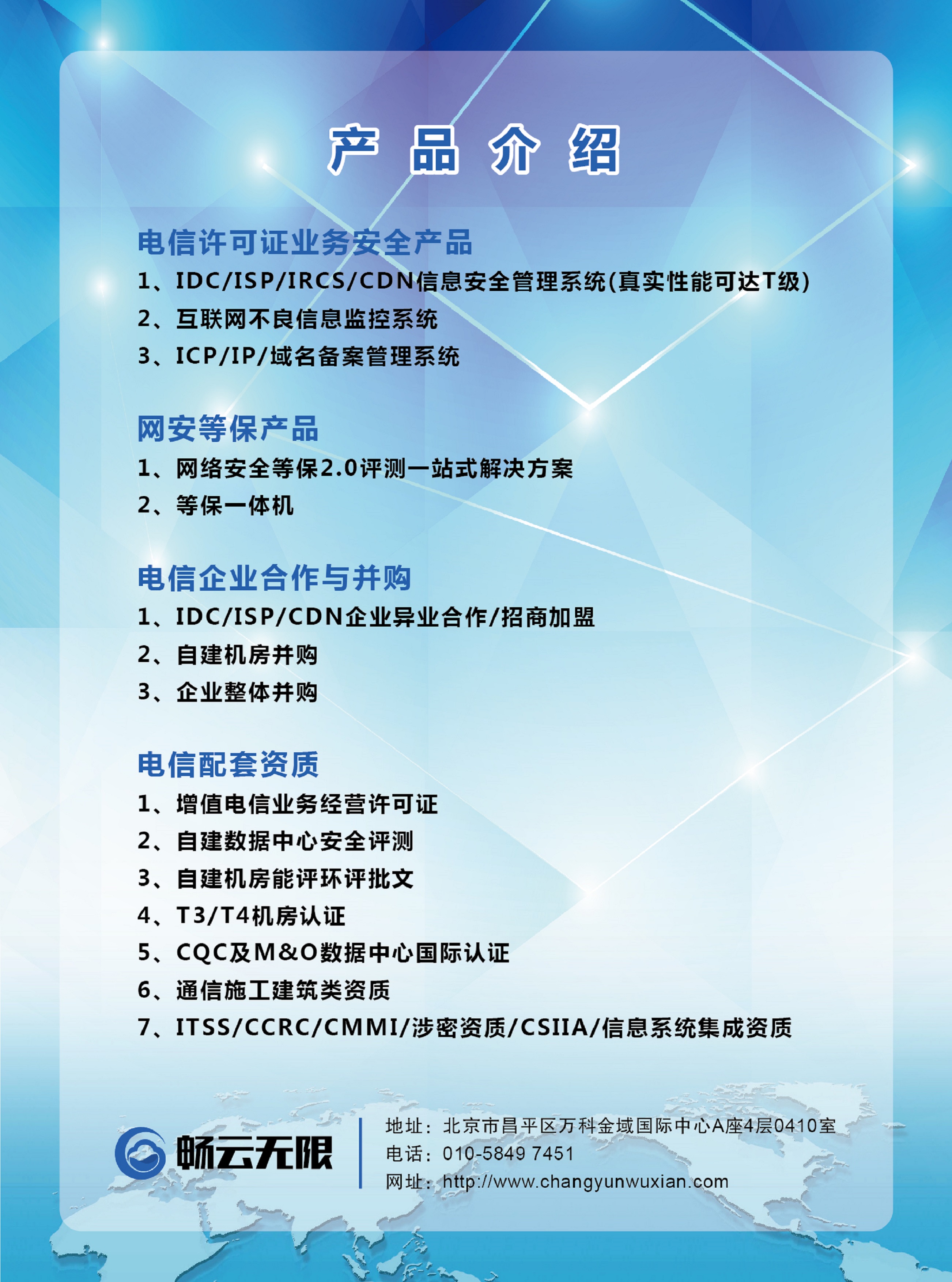 北京畅云无限信息技术有限公司致力于IDC、云、CDN大数据和云计算基础服务流量管理、云安全、云存储、全方位感知网络安全态势,各行业都在积极响应国家政策号召,工信部政策导向,公司在“诚信、责任、合一、感恩、发展”的核心价值观指导下,秉承聚焦目标市场,满足客户需求,细节成就品质的经营理念。公司依托于A股上市公司,目前公司人员百余人,与千家互联网企业保持紧密合作,行业经验十余年,畅云无限紧密关注市场需求,以雄厚的技术实力为后盾,陆续开展出网络安全系统,探针平台及其他的网络安全管理等产品。畅云无限以其精湛的技术、专业周到的售后服务,得到了广大客户的充分肯定,并赢得了相当高的商业信誉。 近年来,畅云无限紧密关注市场需求,以雄厚的技术实力为后盾,陆续开发出网络安全系统,探针平台及其他的办公用材等产品。畅云其精湛的技术、专业周到的售后服务,得到了广大客户的充分肯定,并赢得了相当高的商业信誉,同时公司也主营系统集成方面业务。 畅云无限为工信部认定重要服务商,最近跟众多大公司签订技术咨询合同,为众多名企办理全网IDC,全网ISP,地网IDC和地网ISP资质,全网SP资质,地网SP资质,ICP资质,VPN资质,CDN资质,互联网资源协作资质,虚拟运营商资质,61城市宽带接入网资质,合作的大客户包括蓝讯,光环新网,万网数据,中金,网宿科技,UPYUN,北京首都在线,企商在线,上海数据港,联想集团,四川艾普,赛伯乐集团,网宿科技北京分公司,博大集团,德利迅达,大连致远,上海用九网络,北洋集团,白山云科技,等众多大型集团客户,我们有绝对的经验和优质的服务体系,确保客户在第一时间拿到牌照和通过三套系统和机房安全运行系统工信部评测,通过国家工信部认证。 |