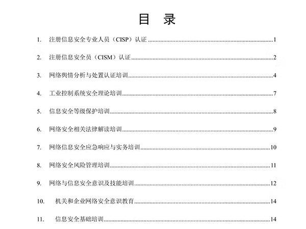 本培训按照网络舆情分析与处置教学体系设计,区别于专题讲座培训模式,是由中国网络安全审查技术与认证中心统一管理和规 范的专业系统化培训,为目前国内最为主流及被业界认可的信息安全保障人员资质培训。