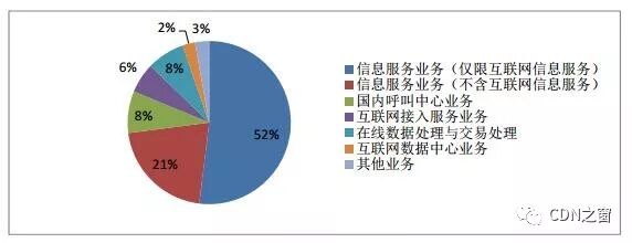 按照2015版《电信业务分类目录》中增值电信业务分类, 46632家增值电信企业合计拥有57150个许可项目。其中,29644个信息服务业务(仅限互联网信息服务),12006个信息服务业务(不含互联网信息服务),4746个国内呼叫中心业务,4293个在线数据处理与交易处理业务,3411个互联网接入服务业务(以下简称ISP),1417个互联网数据中心业务(以下简称IDC),其他业务1598个。