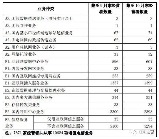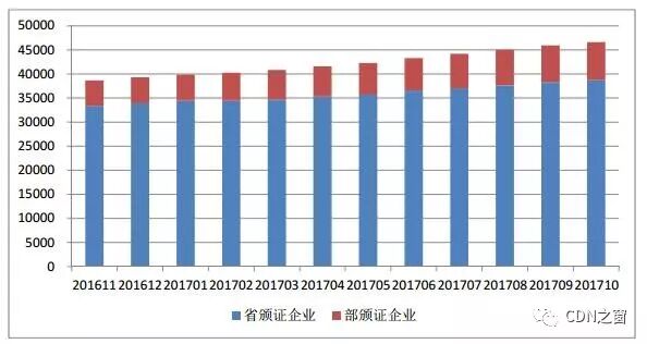 截至2017年10月底,全国增值电信业务经营许可企业共46632家,其中工业和信息化部许可的跨地区企业7871家,各省(区、市)通信管理局许可的本地企业合计38761家,较上一月分别增长1.50%、2.90%、1.22%。