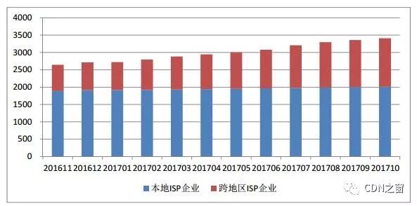 截至2017年10月底,全国ISP持证企业共3411家,其中工业和信息化部许可的跨地区企业1399家,各省(区、市)通信管理局许可的本地企业合计2012家,较上一月分别增长1.52%、3.10%、0.45%。