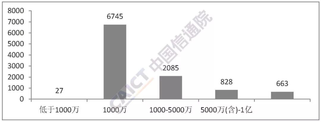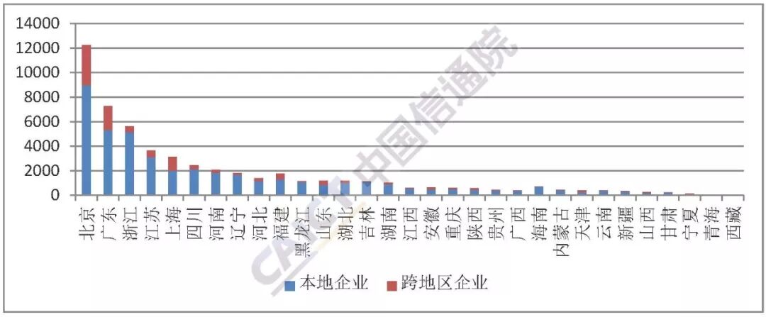 图1 全国持证企业数量(家) 目前,全国增值电信业务市场区域发展不均衡特征突出。在10348家跨地区企业中,注册地在北京的3284家,广东的1951家,上海的1099家,三地集中了61.2%的跨地区企业。部分西部地区的跨地区企业数仍停留在个位数字。 在42867家本地企业中,北京8971家,广东5307家,北京、广东两地的增值电信企业数量在全国遥遥领先,接下来依次是浙江、江苏、四川、上海等,6地集中了全国62.2%的增值电信企业,西部12省份的增值电信业务经营者仅占全国的12.3%。 图2 持证企业按地域分类情况 按照2015版《电信业务分类目录》中增值电信业务分类, 53215家增值电信企业合计拥有65486个许可项目。其中,33456个信息服务业务(仅限互联网信息服务),12791个信息服务业务(不含互联网信息服务),5884个国内呼叫中心业务,5457个在线数据处理与交易处理业务,3984个互联网接入服务业务(以下简称ISP),1819个互联网数据中心业务(以下简称IDC),其他业务2095个。 图3 业务分类许可情况 二、跨地区增值电信业务许可情况 从各业务跨地区经营者数量来看,排名前三的业务依次是:6491家企业经营移动信息服务业务,3470家企业经营国内呼叫中心业务,1952家企业经营互联网接入服务业务,详见下表(本月新增统计互联网资源协作业务许可数量)。 表1 截至2018年5月末跨地区各类增值电信业务经营者数量 不同经营者间注册资金规模差异较大,但仍以注册资金在1000万元人民币的经营者居多。在目前部颁10348家经营者中,注册资金为1000万元人民币的经营者占经营者总数的65.1%,注册资金在1000万元到5000万元人民币之间的经营者占经营者总数的20.1%,注册资金在5000万元(含)到1亿元人民币之间的经营者占经营者总数的8%,注册资金超过1亿元人民币的大型企业占经营者总数的6.4%,详见图4。 图4 跨地区企业注册资金规模分布 目前国内增值电信领域已经形成日趋多元化的投融资市场,民营资本已经发展成为增值电信业务领域的主力军。截至2018年5月底,部颁增值电信业务经营者中,国有控股企业337家,占经营者总数的3.3%;民营控股企业9949家,占经营者总数的96.1%;外商投资企业62家,占经营者总数的0.6%,详见图5。 图5 跨地区企业经济性质分布 三、本期重点业务介绍——互联网信息服务业务 根据年报数据,截至2017年底,全国互联网信息服务业务持证企业共31061家,其中部颁证企业34家,省颁证企业31027家。按企业属地分类(如图6所示),排名前六且数量超过1000的地区分别为北京、浙江、广东、江苏、四川和上海,企业数量分别为7685家、4243家、4229家、2273家、1793家和1351家,约占全国互联网信息服务业务持证企业总量的69.5%,集中度较高。 图6 互联网信息服务业务持证企业集中度(家) 在业务营收方面,2017年全国互联网信息服务业务收入超过5400亿元,比上年增长24.1%,其中部颁证企业收入仅占总收入的0.5%,比上年增长43.7%,省颁证企业收入占总收入的99.5%,比上年增长24%。主要原因在于互联网信息服务业务属地化管理,除少数涉及外资的企业之外,绝大多数互联网信息服务业务经营企业都从其属地省、自治区、直辖市通信管理局获得经营许可。 数据来源:中国信息通信研究院信息通信业务受理中心