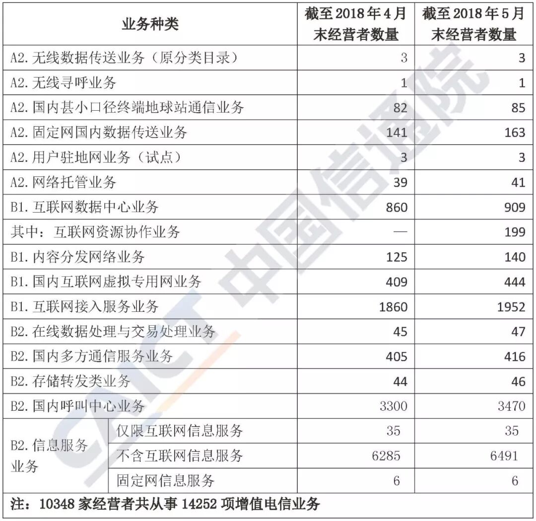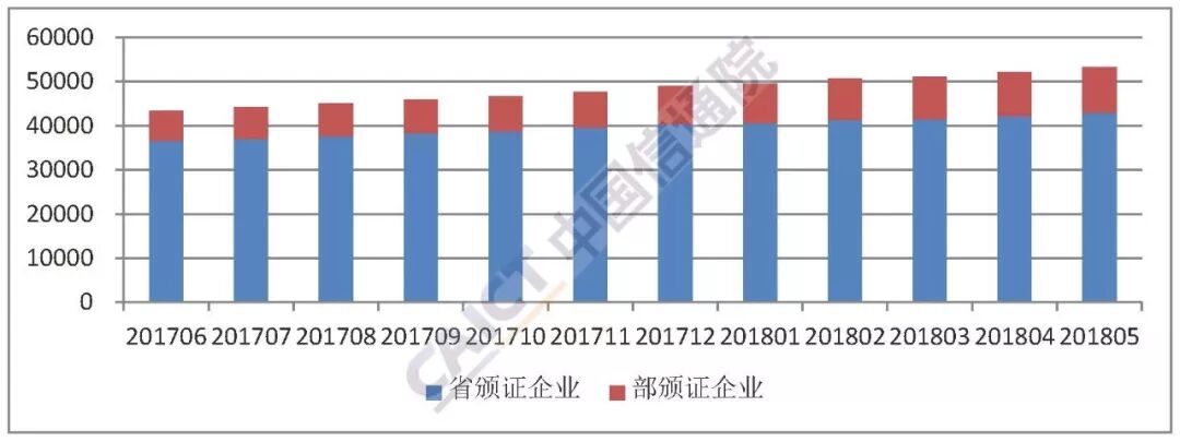 截至2018年5月底,全国增值电信业务经营许可企业共53215家,其中工业和信息化部许可的跨地区企业10348家,各省(区、市)通信管理局许可的本地企业合计42867家,较上一月分别增长2.21%、4.21%、1.73%。